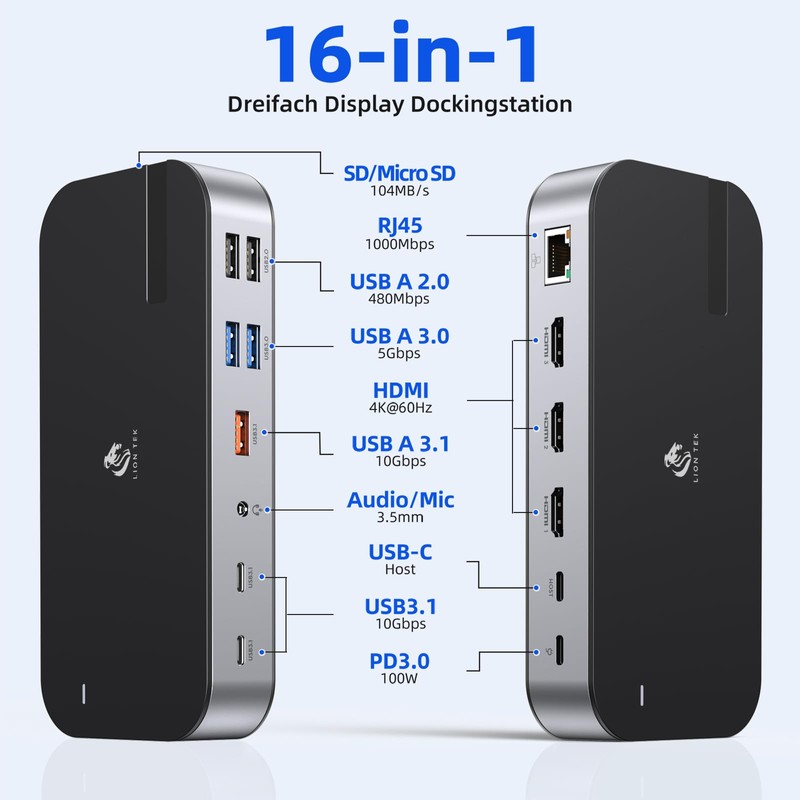 - 【16 in 1 USB C Docking Station】USB C Docking Station 3 monitor with a PD100W port (charging only), Gigabit RJ45 port, 3* 4K HDMI ports, SD and TF card slot, 3 * USB 3. 1 ports, 2* USB 3. 0 ports and 2* USB 2.0 ports, 3.5mm audio port equipped. With a simple plug-and-play connection, the USB C hub turns any Windows system laptop into a mobile workstation. Meet all your needs with a versatile 16 in 1 Laptop Docking Station.(❤️ Note: PD charger included)