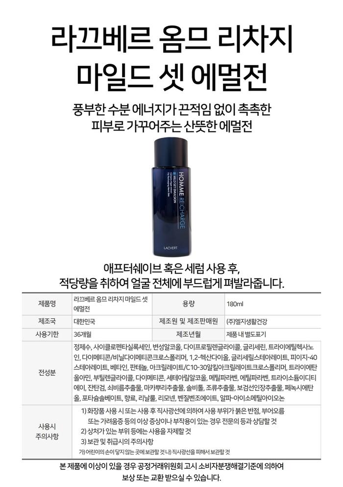 [라끄베르] 라끄베르 옴므 리차지 마일드 셋 에멀전 180ml
