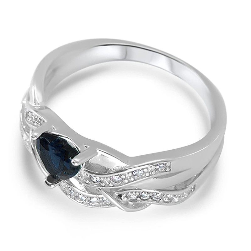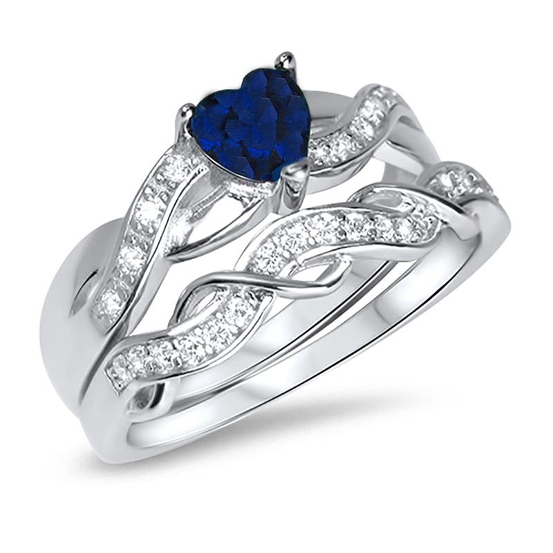 - Sterling silver CZ bridal set featuring a 1 carat simulated sapphire blue heart cut center stone with accent stones in a unique 3-stone setting and a matching CZ wedding band ring