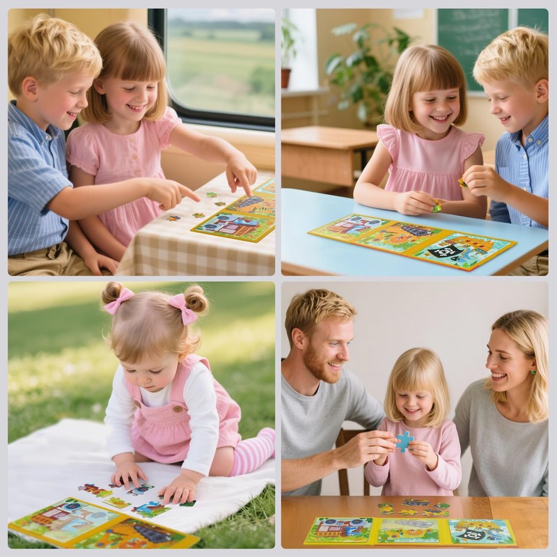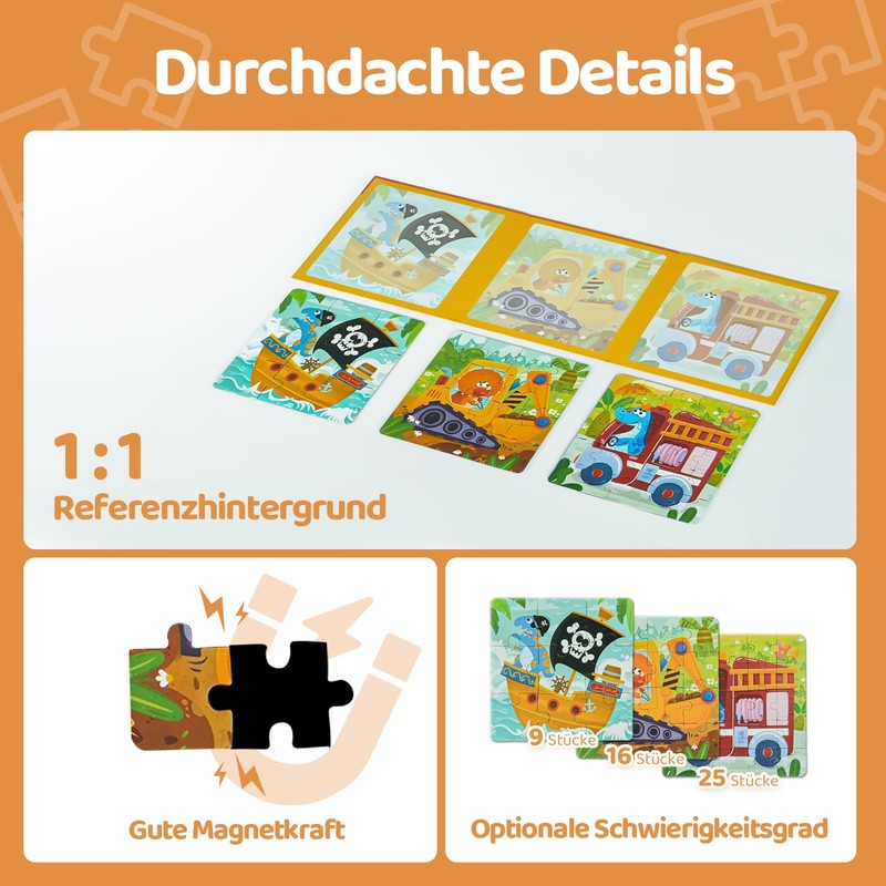 - 3 in 1 magnetic puzzle: a magnetic puzzle book that integrates three traffic scenes (9 pieces / 16 pieces / 25 pieces) that scientifically matches children's ability growth through a gradually increased number of pieces.