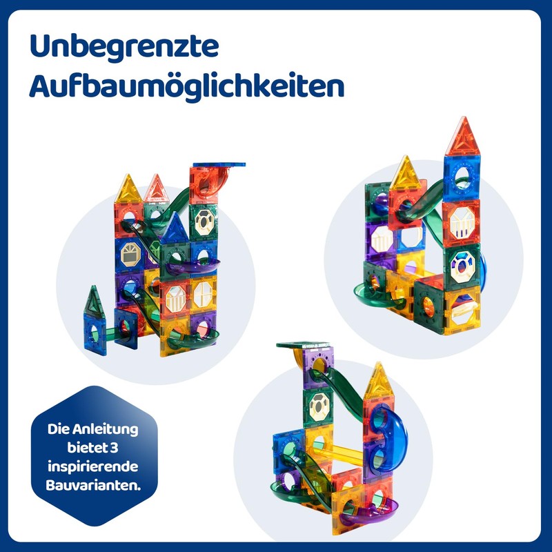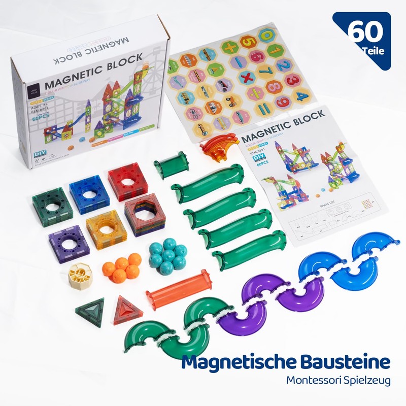 • 60 HIGH QUALITY COMPONENTS 23 strong magnetic building blocks, 18 varied marble runs, 12 roller balls, 5 fun windows, 1 creative sticker and detailed instructions. The instruction offers three inspirational build variants, but the component combinations are almost unlimited, supporting creative extensions from simple to complex.