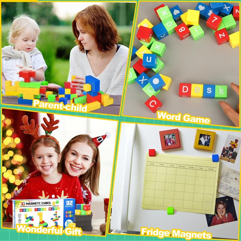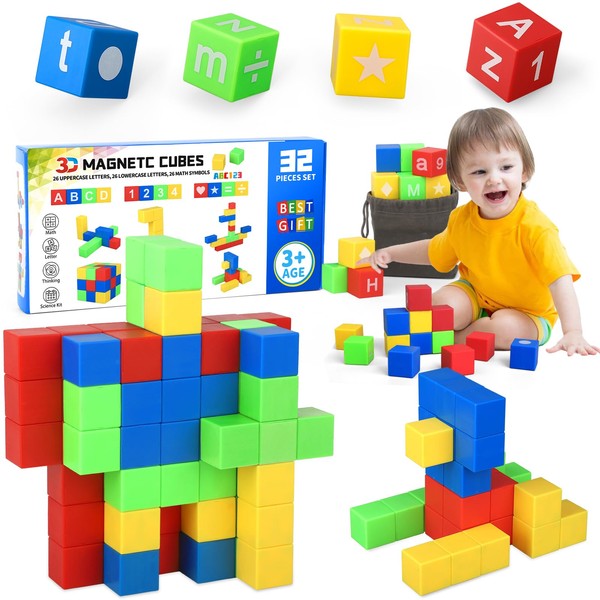 Large 1 Inch Magnetic Blocks for Toddler Toys, Letter Math Alphabet Magnets Sensory STEM Building Block for Boys Girls with Graph, Magic Magnetic 3D Puzzle Cubes Educational Learning Toy 32 Pack