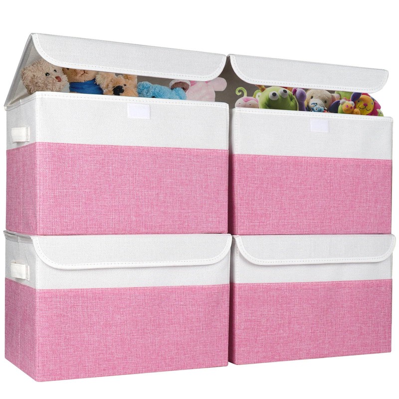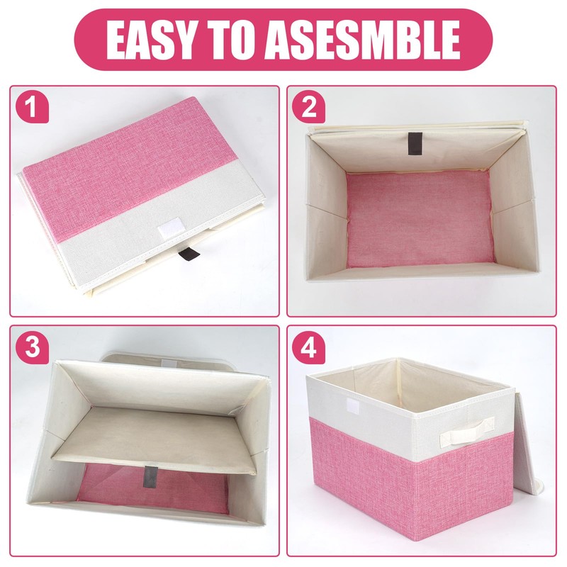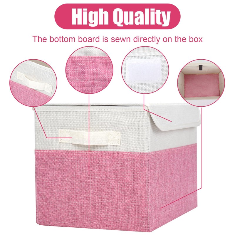 Large 22 Quart Linen Fabric Foldable Storage Bin Cube Organizer Basket with Flip-Top Lid & Handles, Clothes Blanket Box for Home, Office, Closet, Pink & White, 4 Pack 14.6 x 9.5 x 9.5"