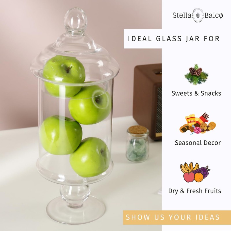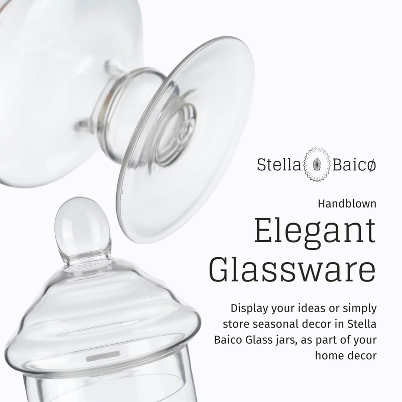 - DECORATIVE JAR: Stella Baicø classic footed candy jar with lid is perfect for various decorative uses. Fill it with pinecones, seashells, maple leaves, or flowers to enhance your space with a stylish and natural touch.