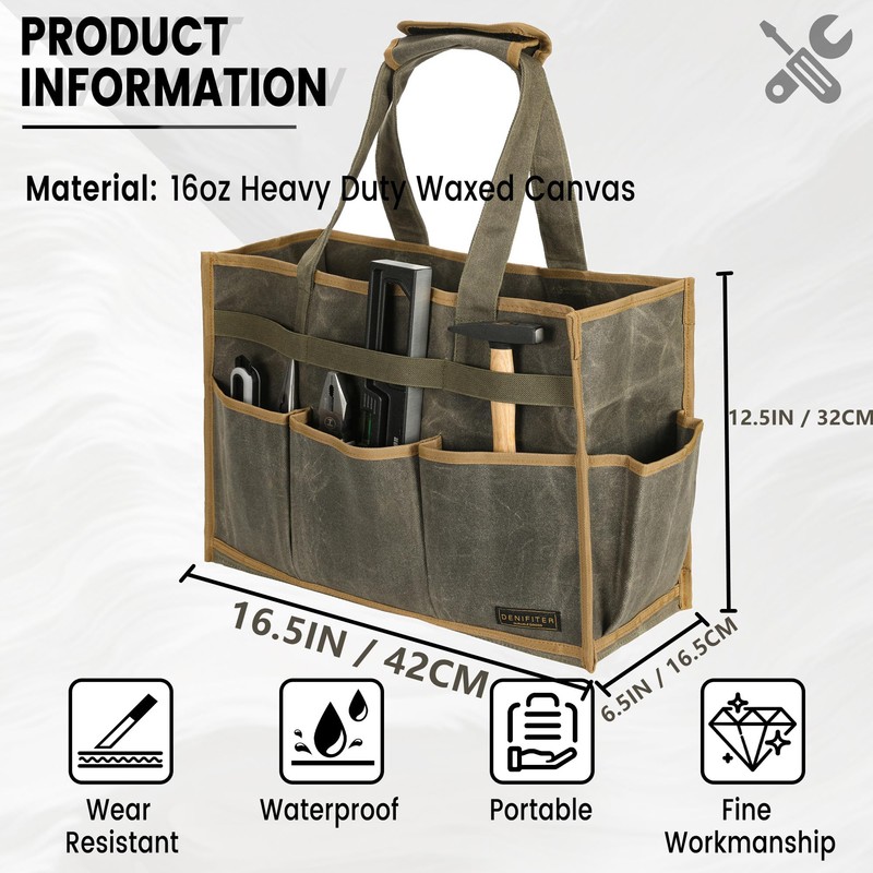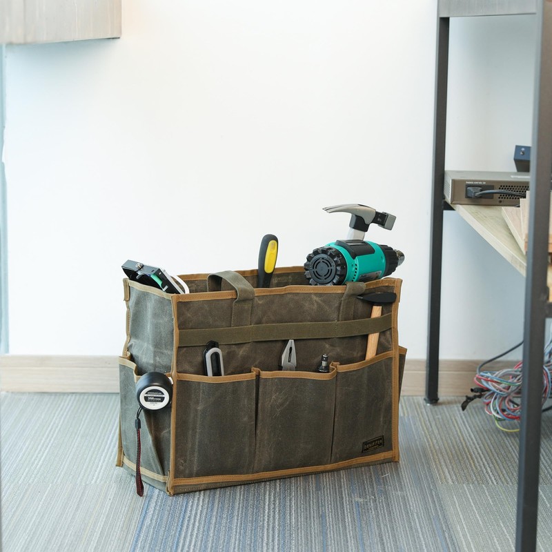 Large Canvas Tool Bag - One Large Main Pocket and 8 Exterior Pockets - Heavy Duty Waxed 16oz Canvas Tool Box with Handle - 15.5 x 5.9 x 11.5 Inches | Army Green
