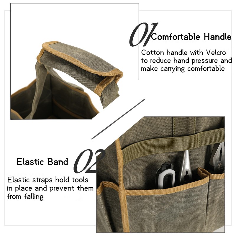 - PRODUCT DESIGN This tool bag features 8 outer pockets with elastic band reinforcement to maximize space and a large main compartment. It can help you organize and easily identify your tools, saving space and time.