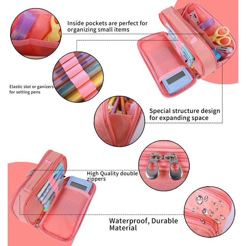 - Multi-storage – Two double-zipper openings with 10 mesh pockets, 7 pens elastic loops, 2 inner zipper pockets, will definitely keep all stuff neat tidy; can hold 60-80 pens or similar items
