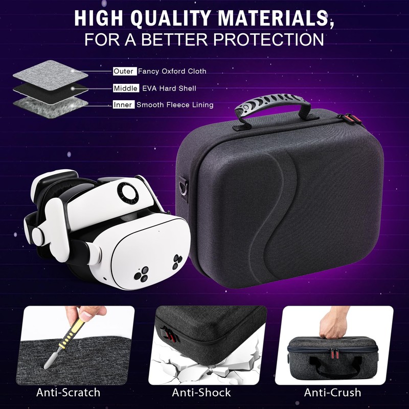 - 【3】PREMIUM DURABLE SHELL: The center layer of EVA hard shell is well-supported to protect Quest 3S from crushing. The outer layer is made of premium Oxford fabric and lined with soft polyester fleece, which prevents scratches on your equipment and allows you to travel hassle-free on the go.