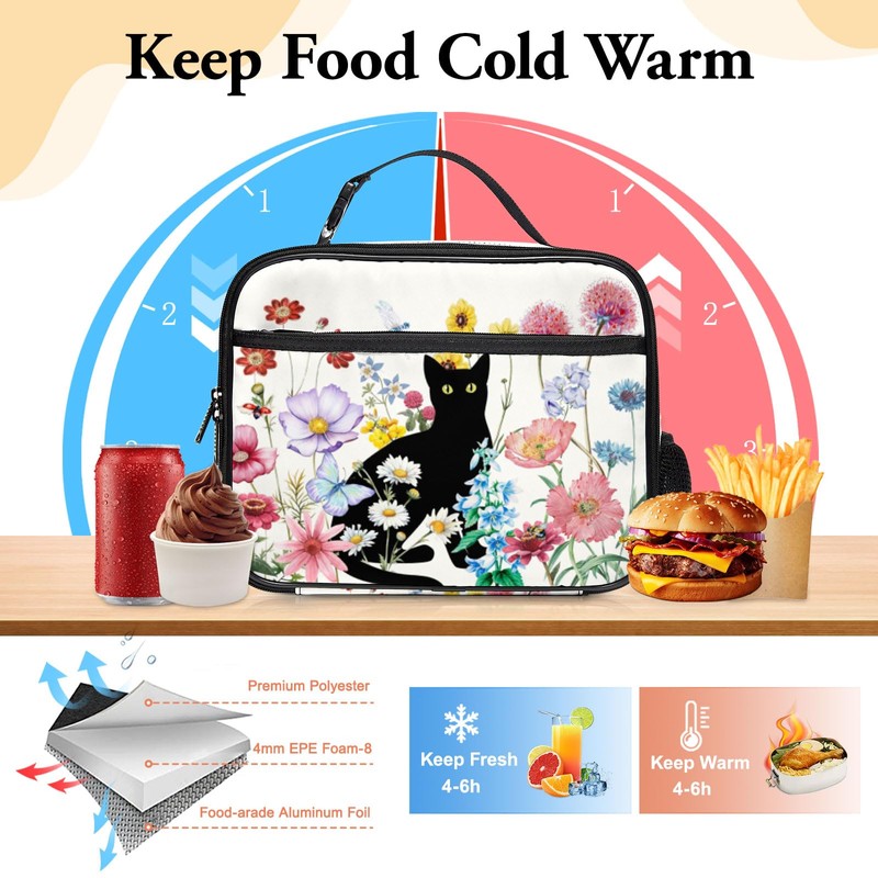 - Cat Lunch Box: stylish and eco-friendly 300D polyester flower cat print lunch box is the perfect accessory for your daily lunch routine. With its eye-catching and playful cat print, this lunch box is perfect for both kids and adults and will keep you feeling happy inspired throughout the day.