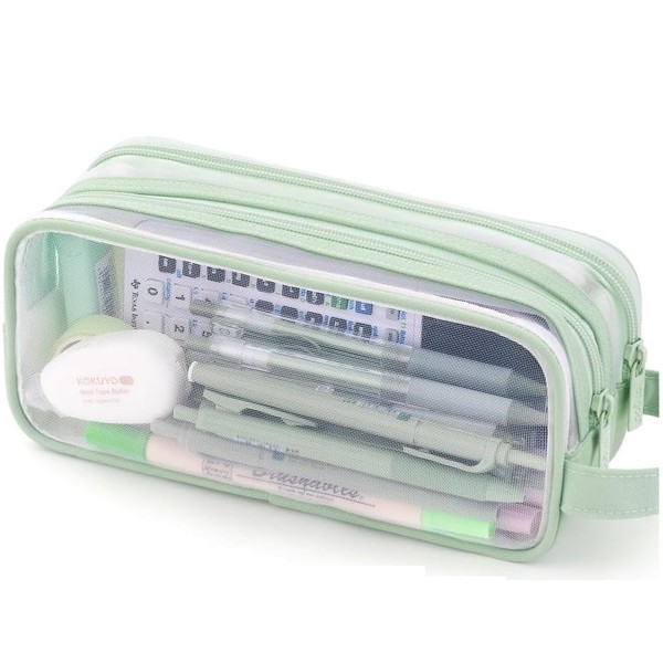 Large Clear Mesh Pencil Case Pouch, 2 Compartment Pen Bag Multifunction Pencil Pouch Transparent Makeup Bag for Teen Student College Business Travel Office Adult (Green)