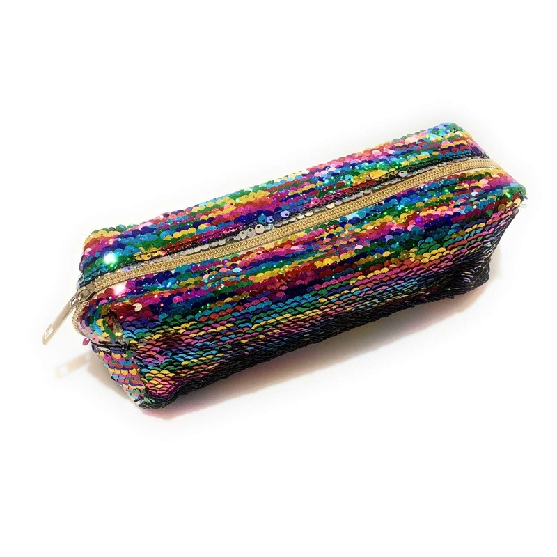 Large Colourful Rainbow Silver Reversible Sequin Pencil Case School College Uni Make Up Bag Pouch for Girls