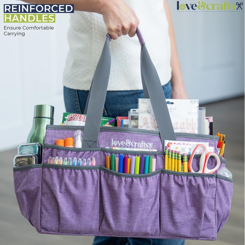 Large Craft Organizer Tote Bag - Art Bag 16 x 7.9 x 9.5 with Elastic Side Pockets to Keep Markers Tidy - Durable Craft Bag Organizer Tote - Caddy Organizer with Handle and Removable Divider (Purple)