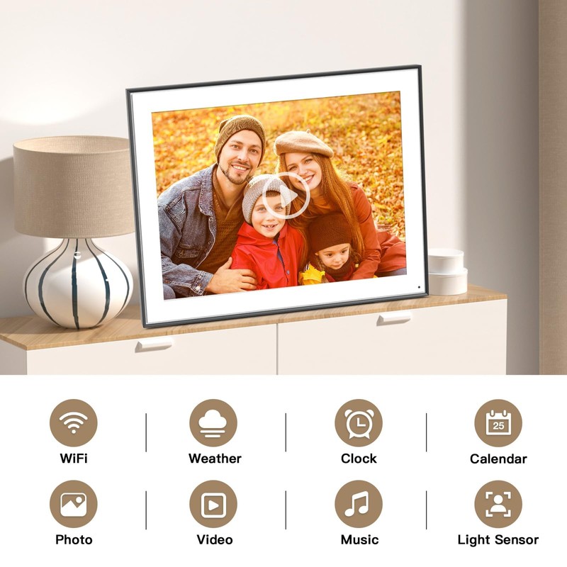 - 【Effortless Setup and Versatile Features】 This large smart digital picture frame comes packed with customizable settings for an optimal viewing experience. Easily toggle slideshow mode, background music, weather/calendar, sleep mode, captions, and more on the 17 inch digital picture frame. Intuitive controls of the digital picture frame large lets you adjust the photo display interval and screen brightness to your liking.