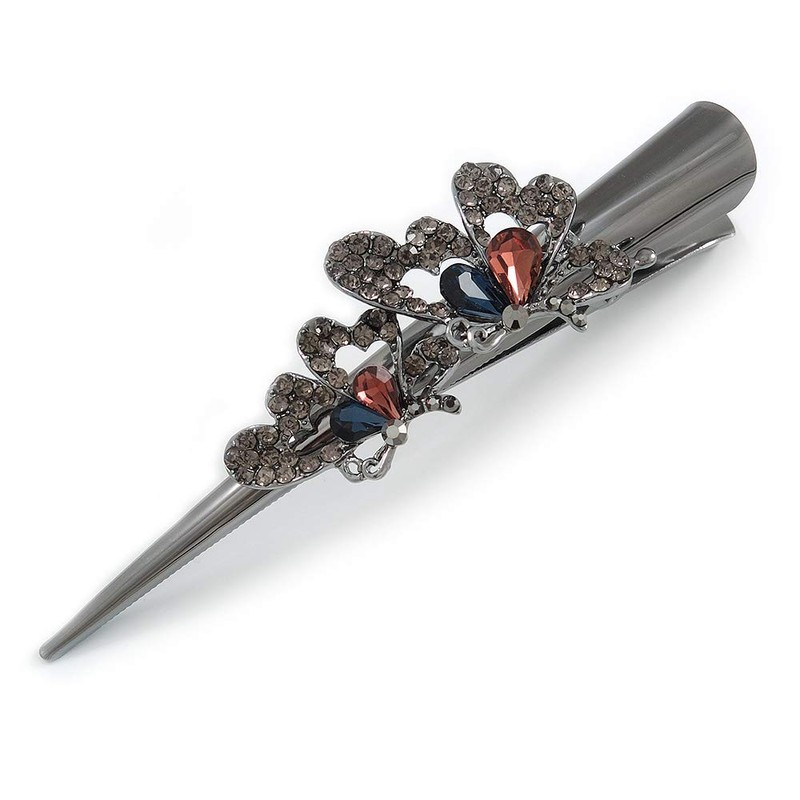 Large Dim Grey/Midnight Blue/Plum Austrian Crystal Butterfly Hair Beak Clip/Concord Clip In Black Tone - 13cm Length