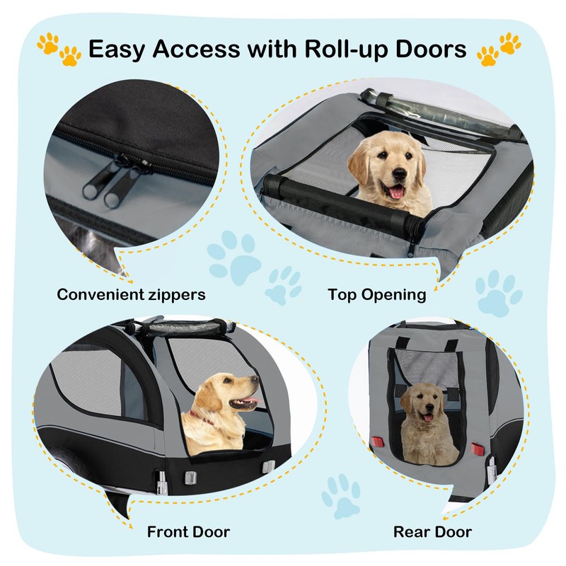 - Convenient & Folds to Store- The quick release wheels and folding frame pack up neatly for compact storage and transport of this dog bike wagon. Zippered Front & Rear doggy door allow for easy entrance and exit.