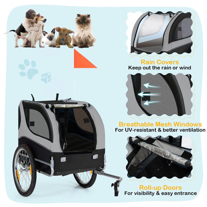 - Spacious Cargo Bike Trailer - With 90-pound carrying capacity, easy-to-clean cushioned pet pad, the wheeled dog house offers a roomy interior; mesh windows with roll-up Rain/Sun-proof curtains keep your pet stays cozy with plenty of fresh air and a great view.