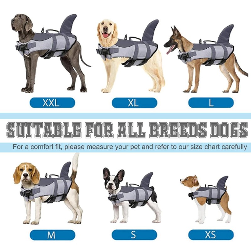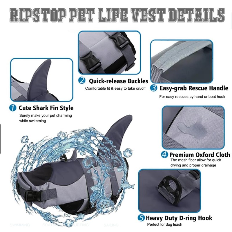 • 【Premium-Material】This dog life vest is made of high grade polyester oxford & nylon and mesh fabric, which is not only ripstop but also allow for quick drying and proper drainage. The dog swimsuit offers great buoyancy they need while moving freely in the water. Whether it's a boat ride or a beach day, our shark fin dog life jacket is your pup's ticket to adventure.