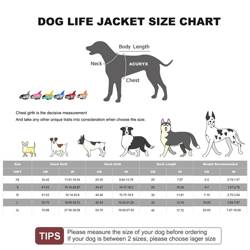 • 【Available sizes】The pet life jackets are available in 6 sizes, from XS to XXL, suitable for most dogs. Please measure your dog twice to get a size and refer to the size chart to choose the right size for your dog. Tips: If your dog is between two sizes, we recommend the larger size.