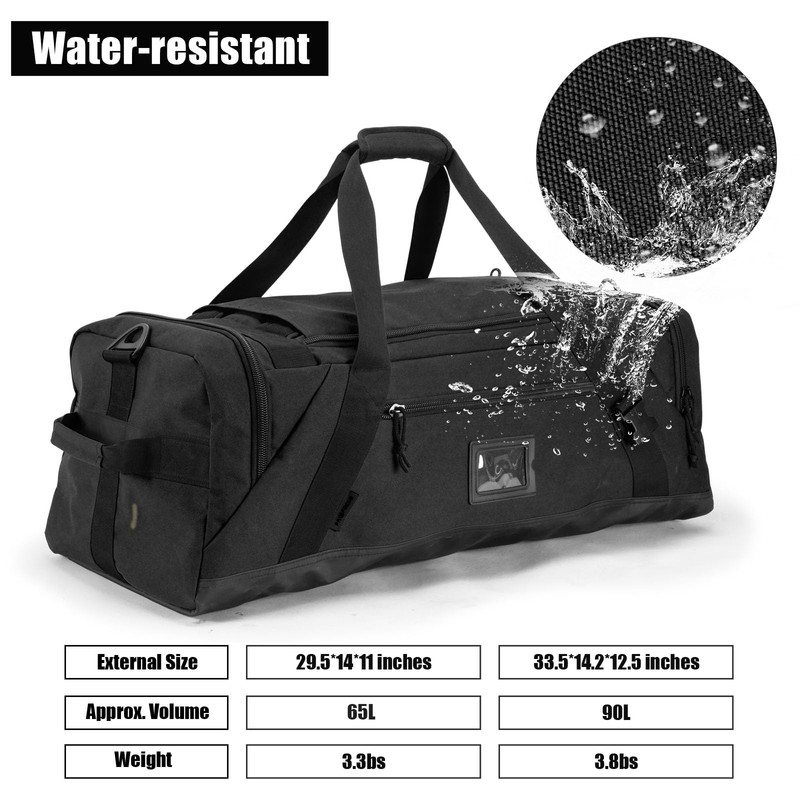 - Fabric: large tactical duffle bag is made of encrypted 600D high quality polyester with PVC waterproof backing treatment. Sturdy and durable is our primary consideration indicator