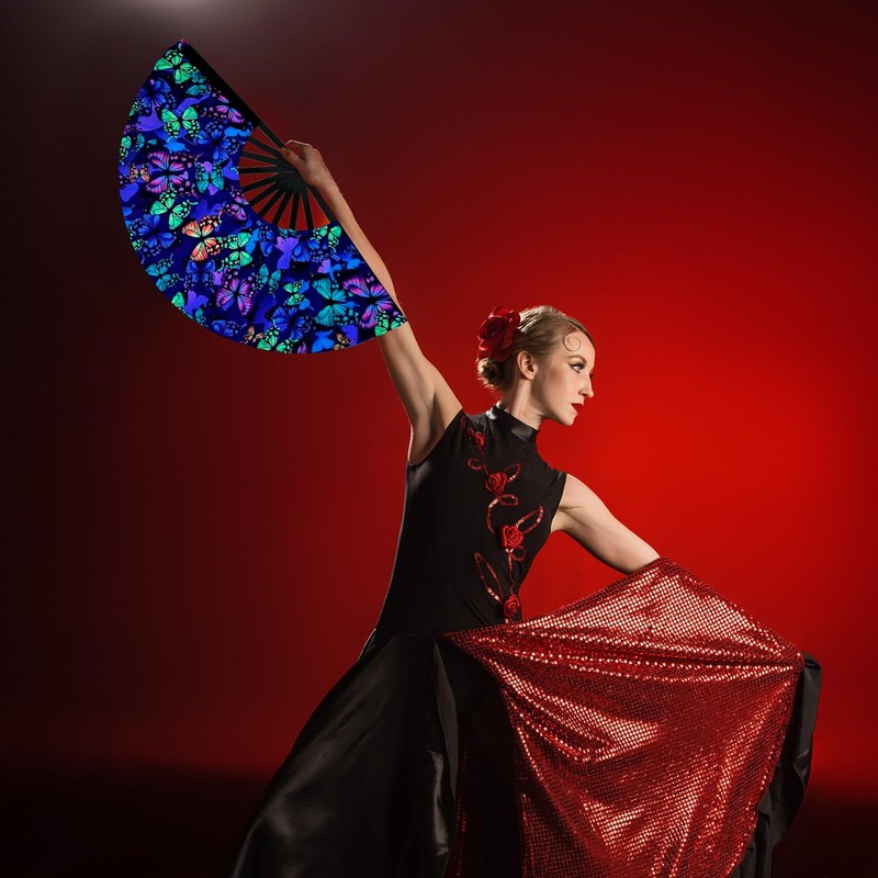 Large Folding Hand Rave Fan, UV Glow Clacking Popping Fan for Line Dancing, EDM Festivals Performances Chinese/Japanese Style Dance with Loud Clack Sound for Boots On The Ground(Butterfly)
