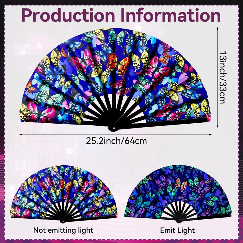 - 【PREMIUM BAMBOO & NYLON CONSTRUCTION】 : Butterfly Print Luminous Premium Folding Fan, Crafted with high-quality bamboo frame and water-resistant nylon fabric, our large folding fan combines durability with elegance. The reinforced stitching ensures long-lasting performance for dance routines, stage shows, and outdoor events