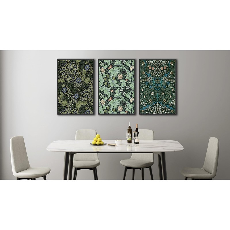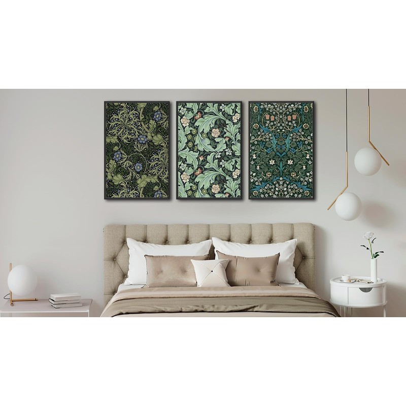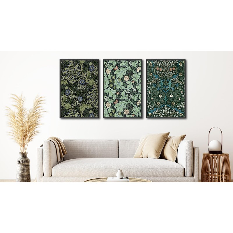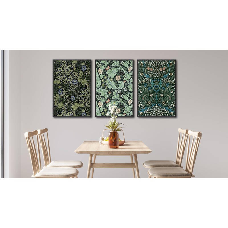 - Opulent Floral Triptych: Intricate floral - vine patterns spread across three artworks. Each has emerald, sage or forest hues. Layered blooms and winding vines blend Victorian charm into every artful detail