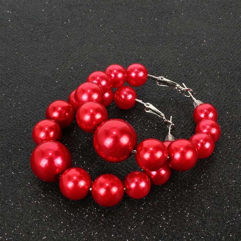 Large Geometric Round Pearls Hoop Earrings for Women, Charm Red Big Balls Beaded Pearls Statement Earrings Exaggerated Round Circles Jewelry Gifts (Red)