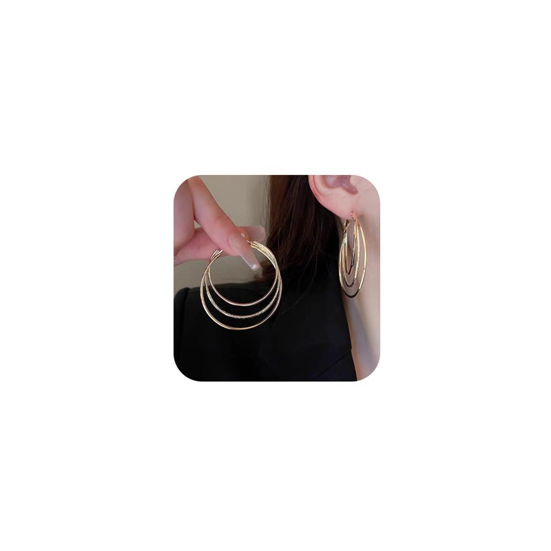 Large Gold Geometric Hoop Earrings for Women Silver Round Triple 3 Circle Layer Statement Hoops Earring Trendy Simple Layered Jewelry Accessories (Gold)