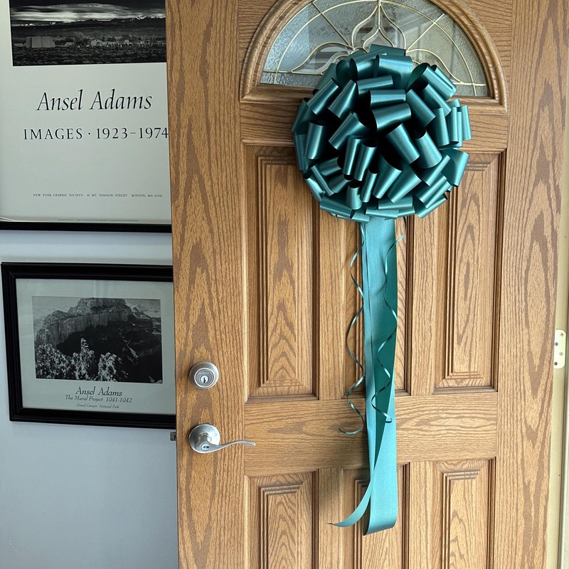- Big decorative gift bow, shipped fully assembled, approximately 16” wide with two matching ribbon tails that create a total length of 42” from top of bow to bottom of tails