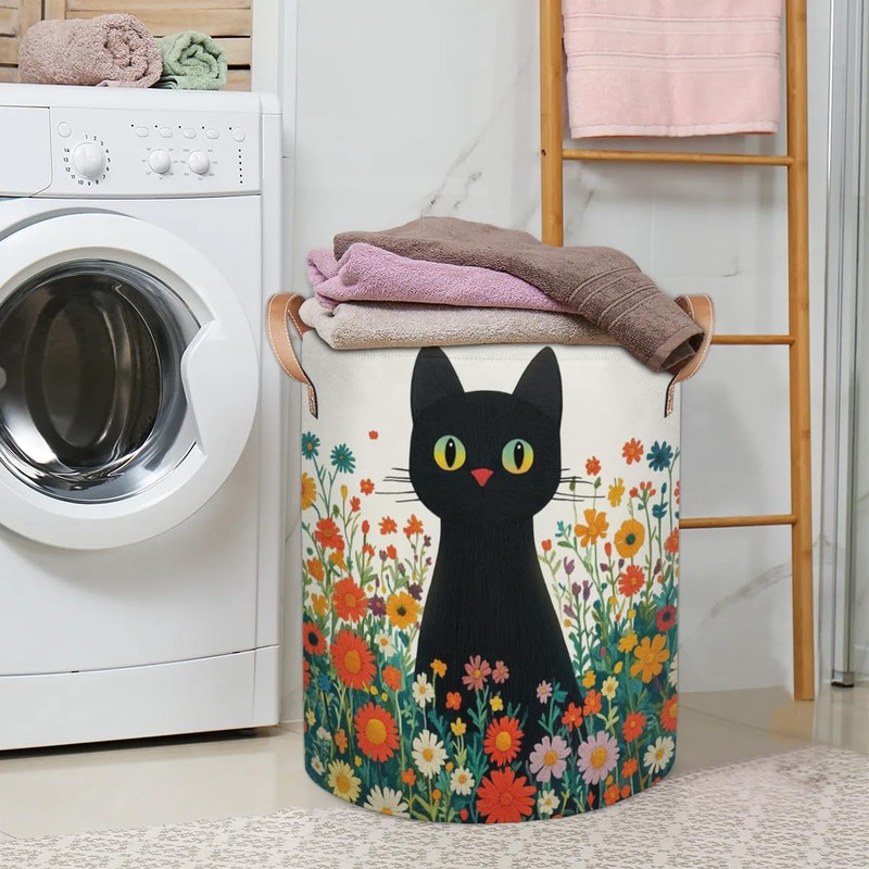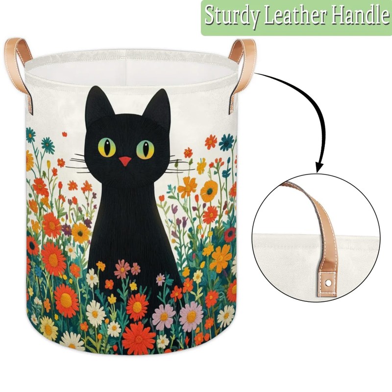 Large Laundry Hamper Basket Black Cat Round Collapsible Storage Organizer Bin for Kids, Boys, Nursery, Closet, Bedroom, Playroom, Toys, Dirty Clothes, 16"W x 20"H