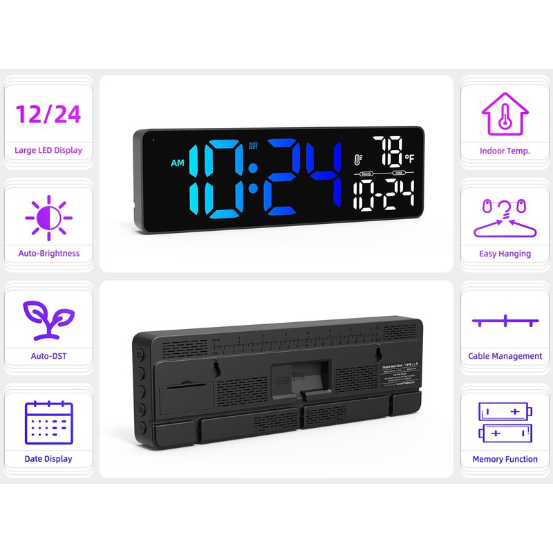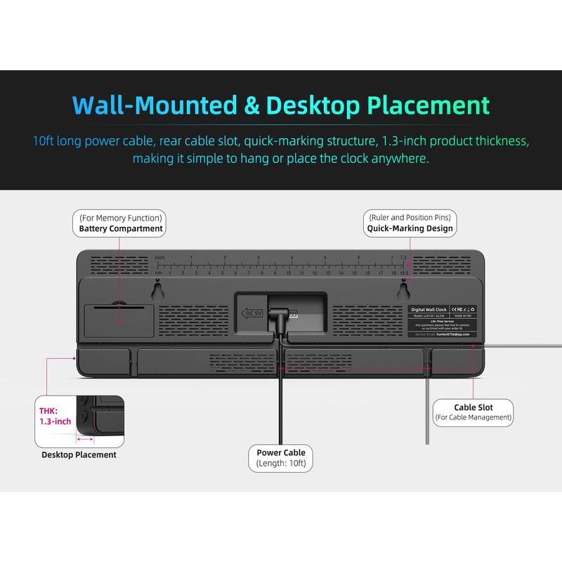 - [SUPPORTS WALL-MOUNTED AND DESKTOP PLACEMENT] -- The 10ft long power cable, rear cable slot, quick-marking structure, and 1.3-inch product thickness, making it simple to hang or place the clock anywhere.