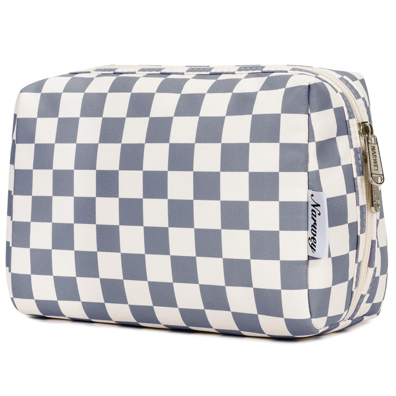 Large Makeup Bag Zipper Pouch Travel Cosmetic Organizer for Women (Greyish Blue Checkerboard, Large)