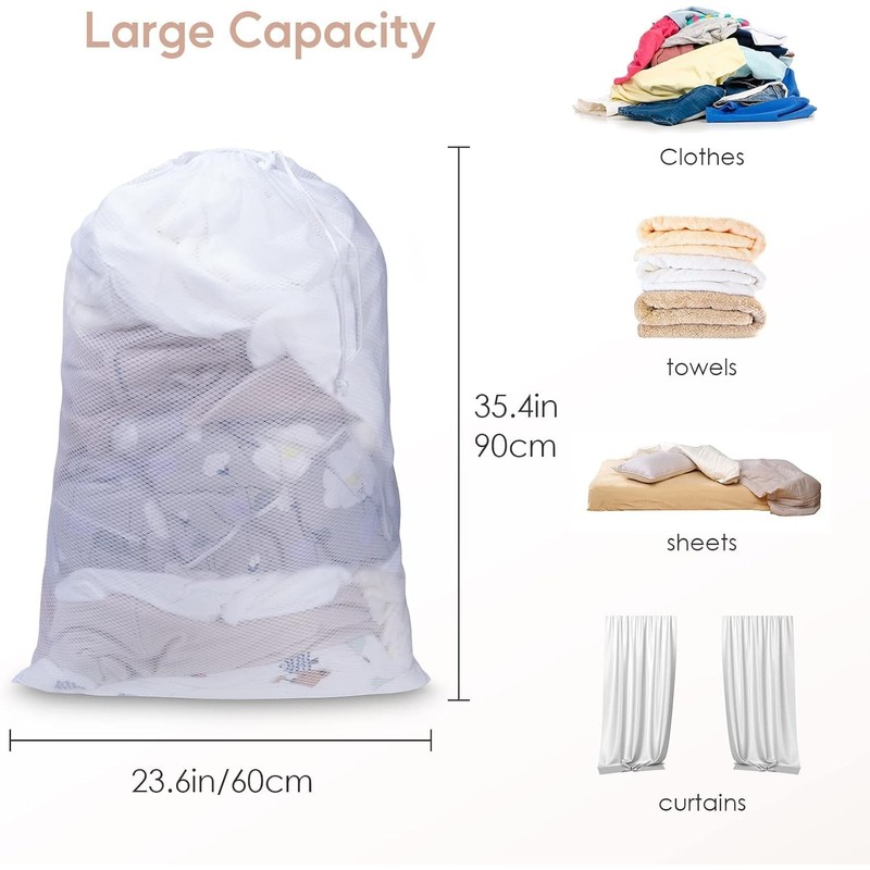 • Versatile Application: These mesh laundry bags for delicates are not only suitable for bed sheets, quilts, large pieces of clothing and plush toys, but can also be used as an item for storage and organization when traveling to keep clothes neat. It is the ideal choice for laundry bag dorm and travel laundry bag. Note: Please tuck the remaining drawstring into the bag before washing.