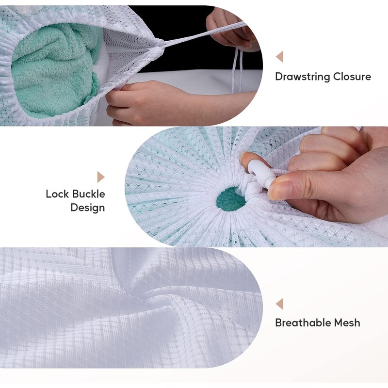 1. Drawstring Lock Closure: This mesh bag drawstring comes with a sturdy drawstring closure to wrap items securely, and the mesh bag has a locking drawstring closure to prevent spillage. If you are using it as a laundry bag, do not move the toggle drawstring lock switch so that the pull cord does not come loose in the washing machine.