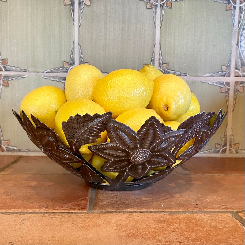 Large Metal Bowl, with Flowers, Rustic Farmhouse Decor, Decorative Home Decor, Handmade in Haiti 11 in. x 11 in. x 4 in.