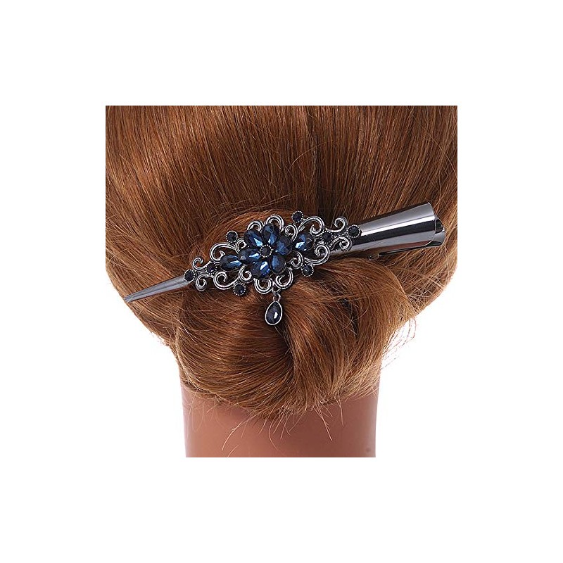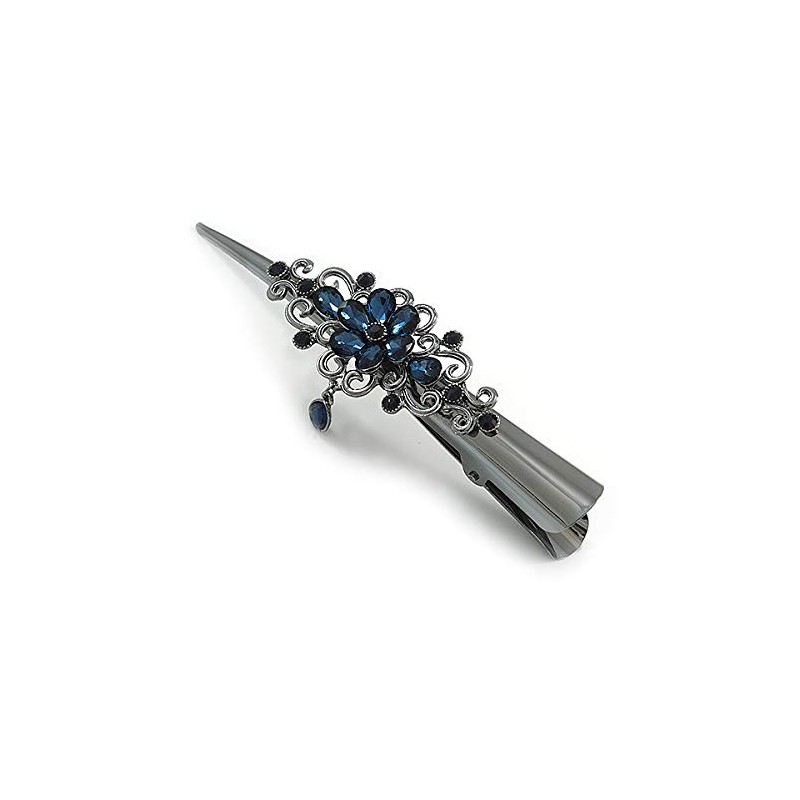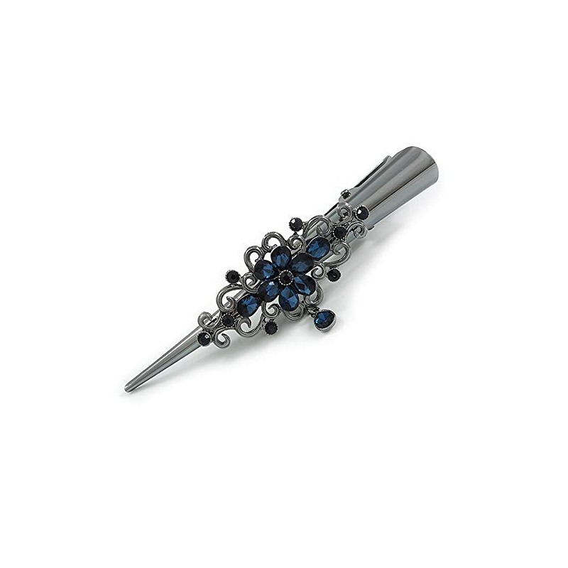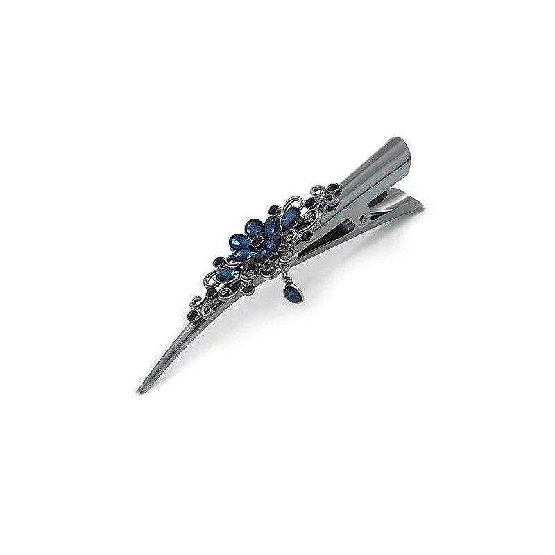 Large Midnight Blue Crystal Flower with Dangle Hair Beak Clip/Concord Clip In Black Tone - 13cm L