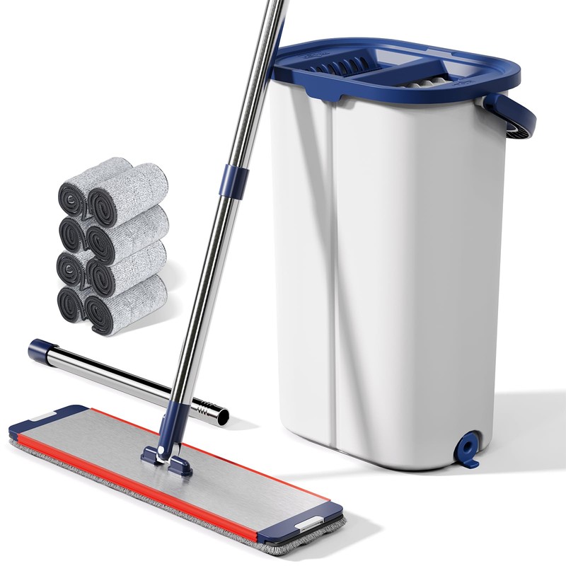 Large Mop and Bucket System with Wringer Set, Hands-Free Flat Mops for Floor Cleaning, Mopping Bucket System with 8 Washable Microfiber Pads for Wet and Dry Use, Home Windows and Wall Cleaner Mop