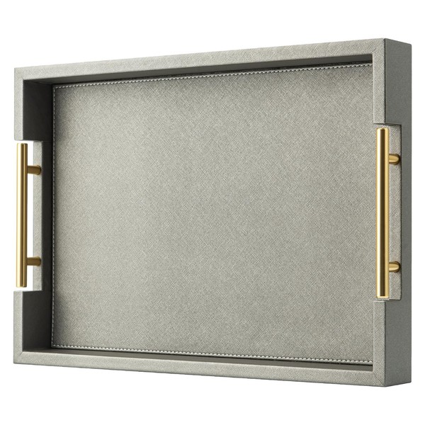 Large Ottoman Tray Gray Faux Leather Decorative Tray,Stylish Rectangle Coffee Table Tray Decor,Versatile Serving Trays with Handles for Living Room Party