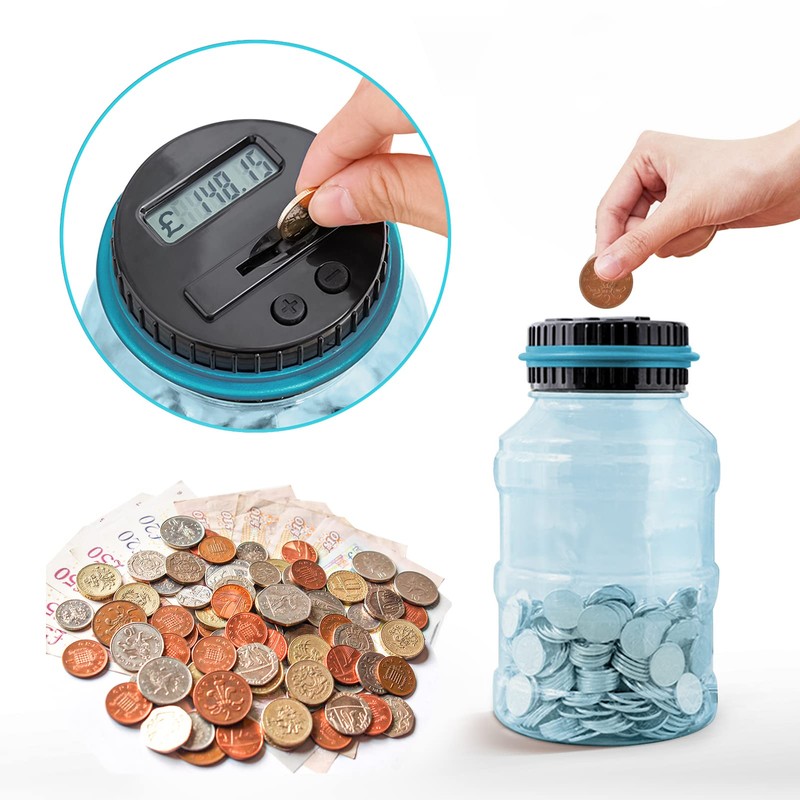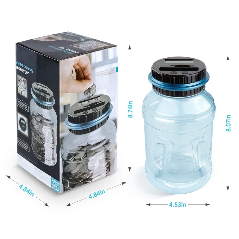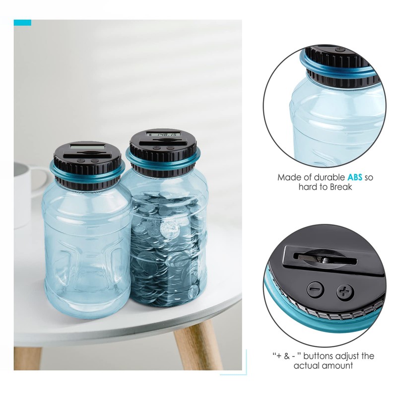 - Know The Amount At Any Time: Coin-counting money jar with legible LCD screen allows you to see the amount of coins quickly and exactly. The digital coin counter is made of ABS plastic. Much more sturdy than glass or ceramic piggy bank