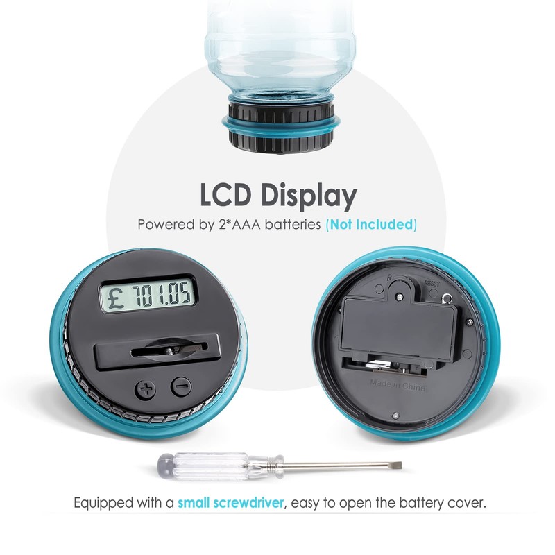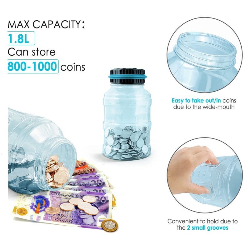 - Designed For All UK Coins: Large capacity up to 1.8L, digital counting money jar can storage 800-1000 coins. The digital counting coin bank accepts all US coins and is powered by 2 AAA batteries(Not Included)