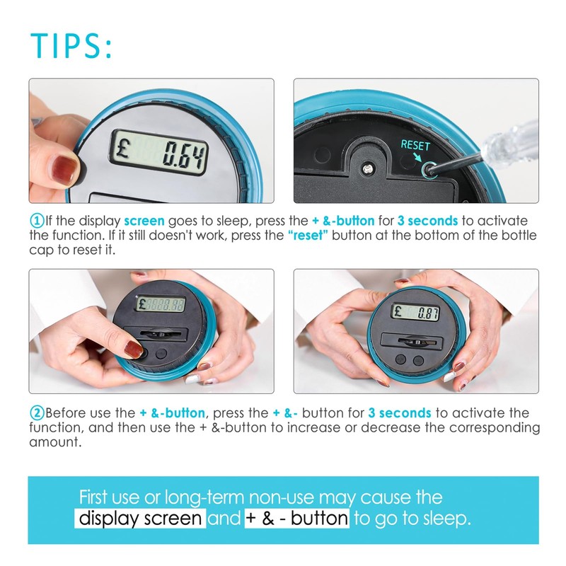 - Nice Accuracy And Flexibility: Digital piggy bank can distinguish coins of all sizes with unique identification technology. Displayed amount adjustable with + and - buttons when you unscrew the lid and put the coins directly in the counting coin jar