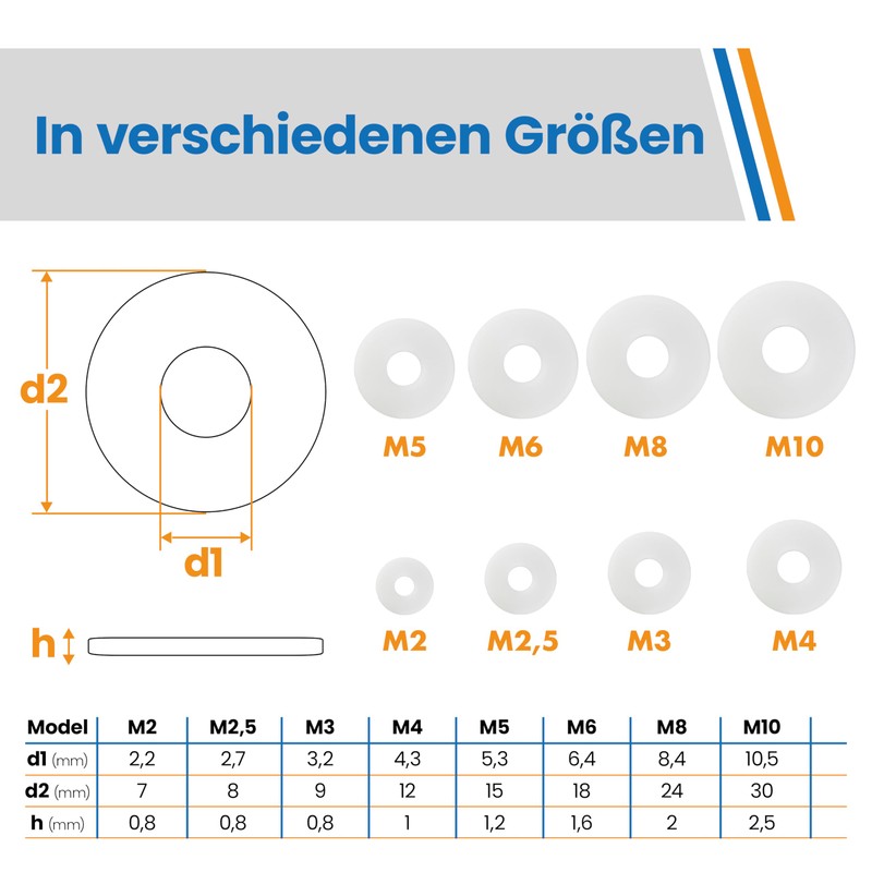 • HEAVY DUTY POLYAMIDE Our washers are made of polyamide, a high-strength plastic that resists corrosion and rust. This makes them perfect for use in humid or demanding environments.