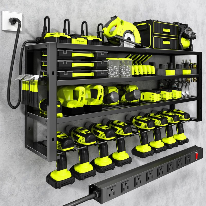 - 8 Outlet Power Strip: This garage storage with charging station with an integrated 8-socket power board and a 6-foot power cord for easy charging. Charge your tools directly on the shelf without the hassle of finding a socket. By combining storage and functionality, this garage tool organizer can save space while ensuring that your power tools are always available.