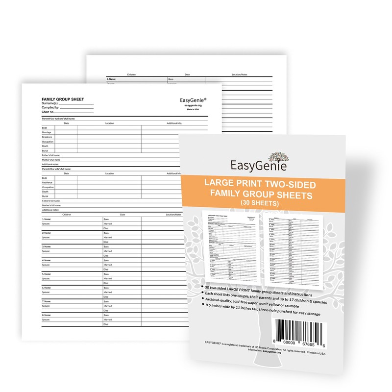 LARGE PRINT Two-Sided Family Group Sheets (30 Sheets) by EasyGenie | Archival-Quality Blank Genealogy Forms To Fill In