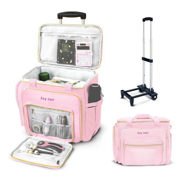 Ezy Roll Large Rolling Tote with Detachable Wheels - Water Resistant Craft Storage Organizer, Work Bag on Wheels, Sewing Machine Case - Pink