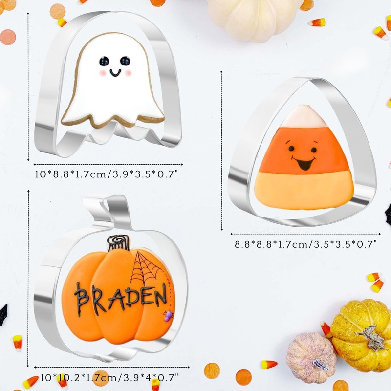 - 3-piece set - Halloween cookie cutters: contains 3 festive Halloween shapes with detailed sizes: pumpkin (10.1 × 10.2 × 1.7 cm / 4 × 4 × 1.8 cm), ghost (10 × 9 × 1.7 cm / 3.9 × 3.5 × 1.8 cm), and 8. .9 × 1.8 cm). 9 × 8.9 × 1.7 cm / 3.5 × 3.5 × 1.8 cm). A fun and practical set to help you create spooky and delicious cookies for Halloween parties, candy or treat gifts and fall baking