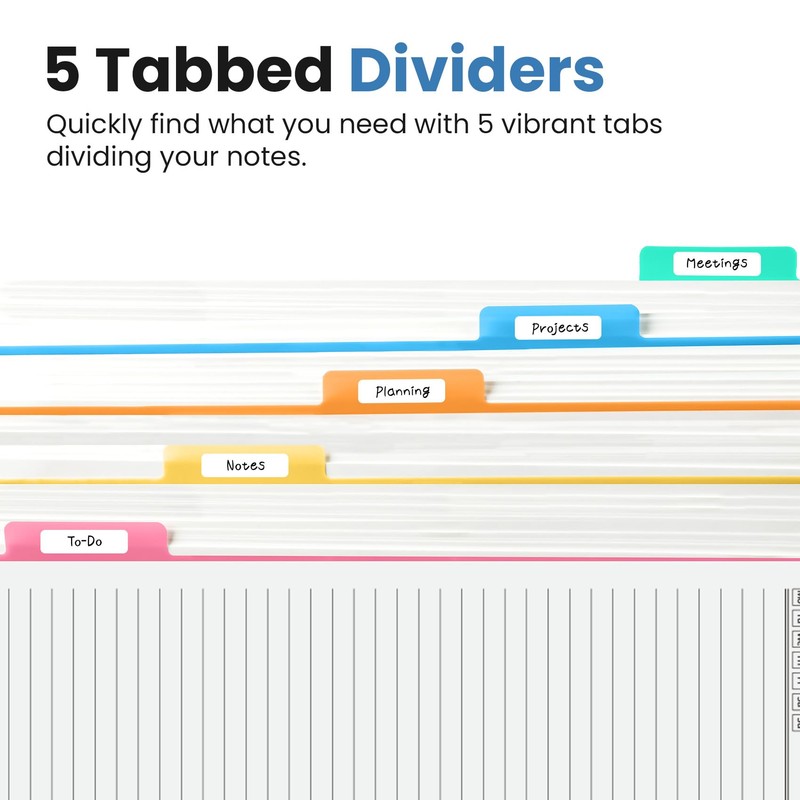- 5 Subject Notebook with Dividers & Tabs: Stay organized with this 5 subject notebook, featuring 5 removable plastic dividers with tabs and 10 self-adhesive labels. These writable tabs make it easy to customize and categorize your notes for different subjects or projects—perfect for both school supplies and work planning.