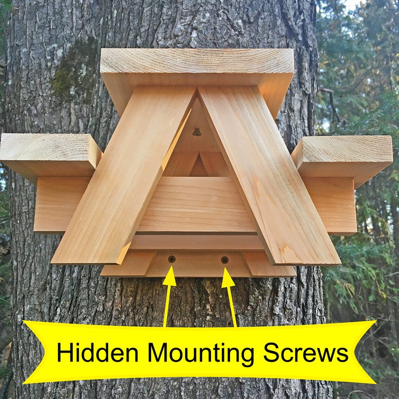 Simply mount the squirrel table feeder to a tree, fence or post by screwing in the 2 screws on the hidden mounting plate. Add some squirrel food like a corn cob (not included), apple, peanuts or other squirrel feeder food. Try adding some peanut butter - squirrels love it! Our wood picnic table for squirrels is a great way to keep them away from your bird feeders. One of the best corn holders for squirrels!