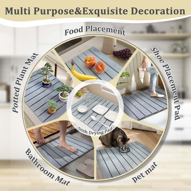 - [MULTI PURPOSE]: It can place washed dishes and cups, and also serve as a thermal insulation pad to protect your countertop. Use it as a comfortable bath pad, convenient insulated tray, and even a practical pet feeding pad - this stone dish drying mat can effortlessly adapt to various situations that require it, making your life simpler and more organized.