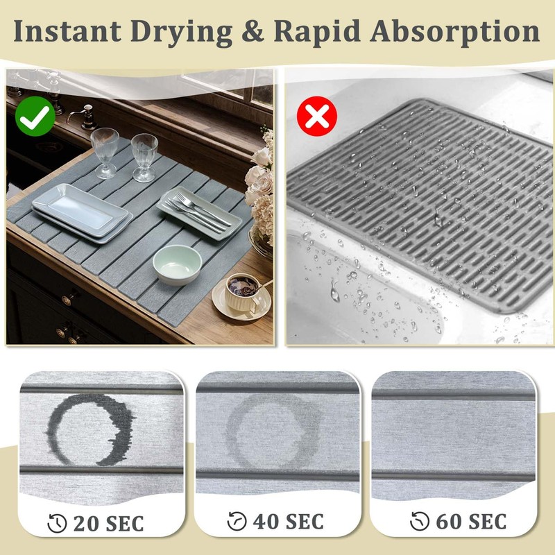 - [INSTANTANEOUS DRYING ABILITY]: This drying pad can absorb 150% of its weight in moisture and evaporate within seconds. Imagine placing a freshly washed dish on a stone dish drying mat, it can quickly absorb the water dripping from the plate, preventing your countertop or cabinet from being filled with water stains.
